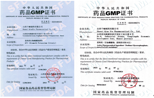 山西千岫制药有限公司于2015年8月取得药品生产许可证,作为原料药生产企业,我们高起点高要求、积极推进同时严格按照药品生产质量管理规范进行管理,并于2016年6月取得原料药枸橼酸铋钾药品GMP证书。在全体员工的共同努力和精心准备下,原料药甘油磷酸钠于今年3月顺利通过山西省药品监督管理局认证专家组现场检查,并于4月8日取得原料药甘油磷酸钠药品GMP证书。